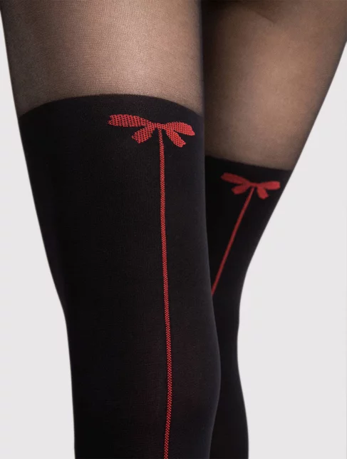 Ciorapi dama imitatie jambiere, cu dunga rosie si fundita , produsi din fibre de tip Lycra, ce ofera flexibilitate si durabilitate.