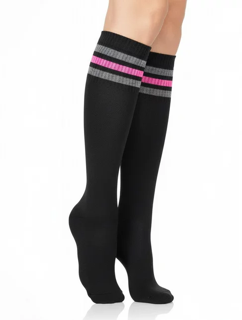 Aceste sosete lungi din bumbac sunt concepute pentru a oferi confort si suport pe parcursul intregii zile. Realizate din fibre naturale cu proprietati antibacteriene, antifungice, antialergice si antistatice, sunt ideale pentru purtarea in sezoanele de primavara si toamna. Banda elastica de sub genunchi asigura o fixare ferma, dar confortabila, fara a strange excesiv. Designul in culoare neagra cu dungi roz si gri adauga un accent modern si atractiv.